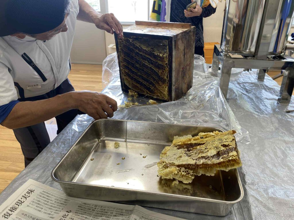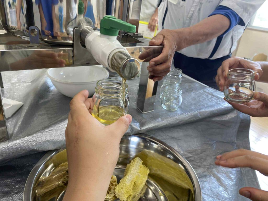 園地で行う摘果作業は暑いので、ほどほどに切り上げクーラーの効いた部屋で採蜜を行いました。日本ミツバチの蜂蜜がたっぷりと入った巣蜜に大盛り上がり。